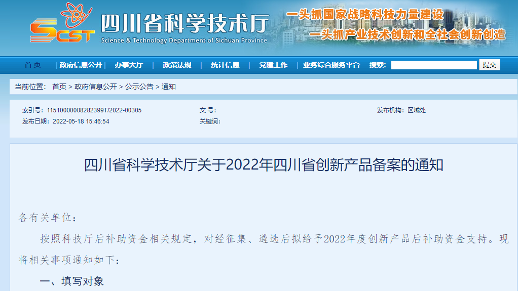 四川省科学技术厅关于2022年四川省创新产品备案的通知
