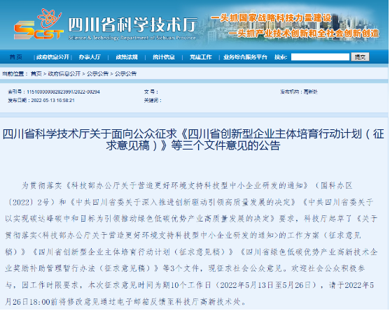 四川省科学技术厅关于面向公众征求《四川省创新型企业主体培育行动计划(征求意见稿)》等三个文件意见的公告