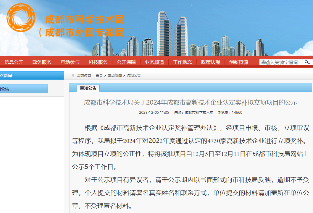 成都市科学技术局关于2024年成都市高新技术企业认定奖补拟立项项目的公示