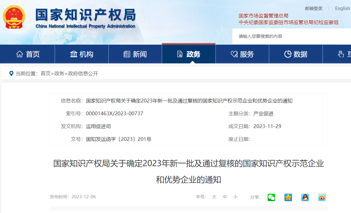 国知局:关于确定2023年新一批及通过复核的国家知识产权示范企业和优势企业的通知