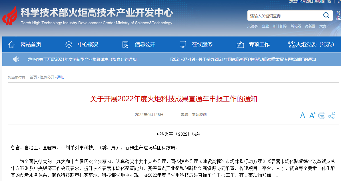 通知 | 关于开展2022年度火炬科技成果直通车申报工作的通知