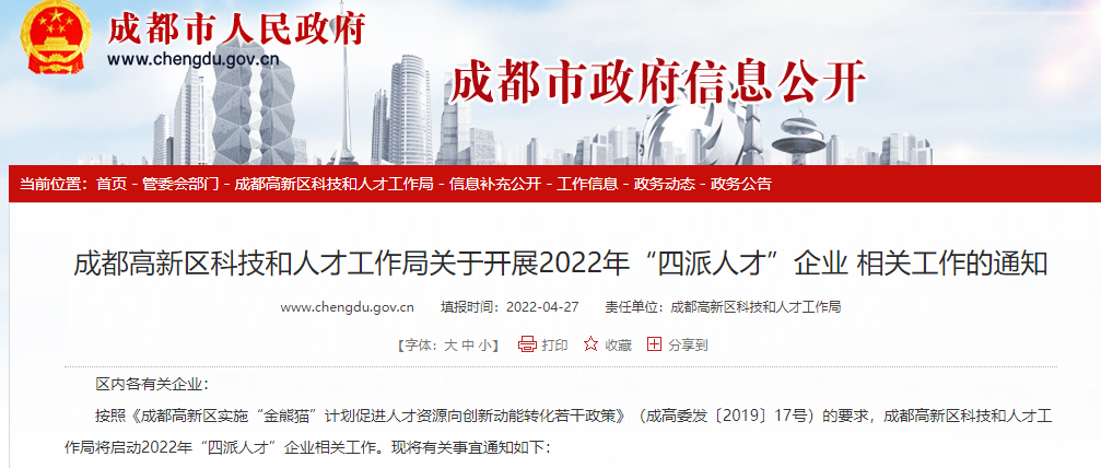 成都高新区科技和人才工作局关于开展2022年“四派人才”企业 相关工作的通知
