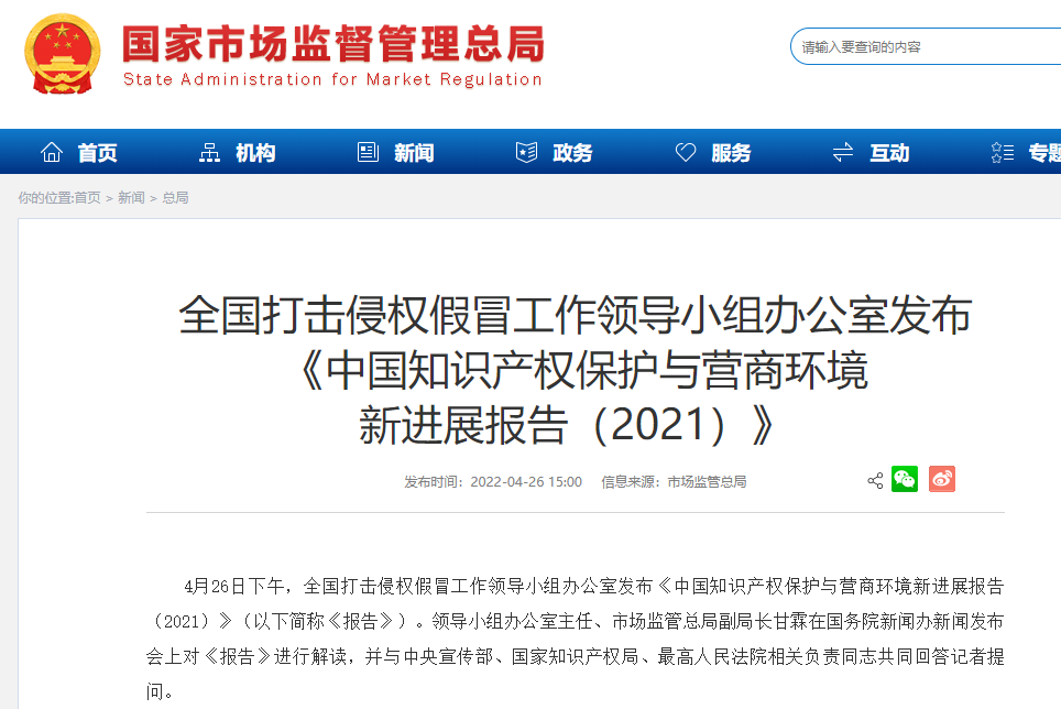 来源:国家市场监督管理总局(版权归原作者所有,本文仅供交流学习,部分文章推时未能及时与原作者取得联系,若来源标注错误或侵犯到您的权益,烦请告知,我们将立即删除)封面图片来自网络全国打击侵权假冒工作领导小组办公室发布《中国知识产权保护与营商环境新进展报告(2021)》4月26日下午,全国打击侵权假冒工作领导小组办公室发布......