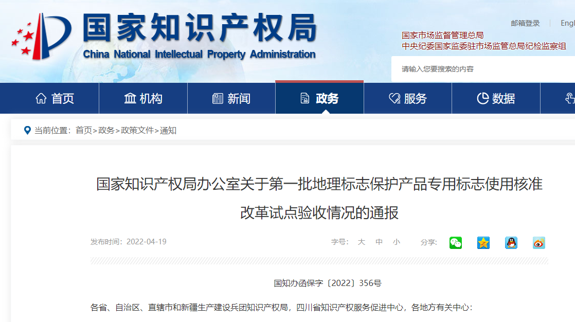 来源:国家知识产权局(版权归原作者所有,本文仅供交流学习,部分文章推时未能及时与原作者取得联系,若来源标注错误或侵犯到您的权益,烦请告知,我们将立即删除)封面图片来自网络国家知识产权局办公室关于第一批地理标志保护产品专用标志使用核准改革试点验收情况的通报国知办函保字〔2022〕356号各省、自治区、直辖市和新疆生产建设......