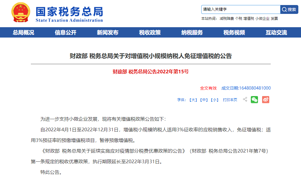财政部 税务总局关于对增值税小规模纳税人免征增值税的公告