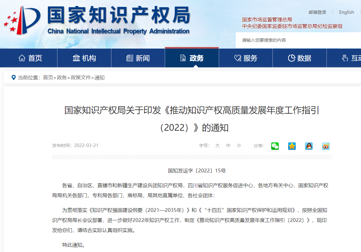 国家知识产权局关于印发《推动知识产权高质量发展年度工作指引(2022)》的通知