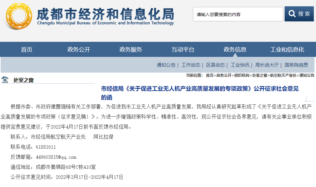 市经信局《关于促进工业无人机产业高质量发展的专项政策》公开征求社会意见的函