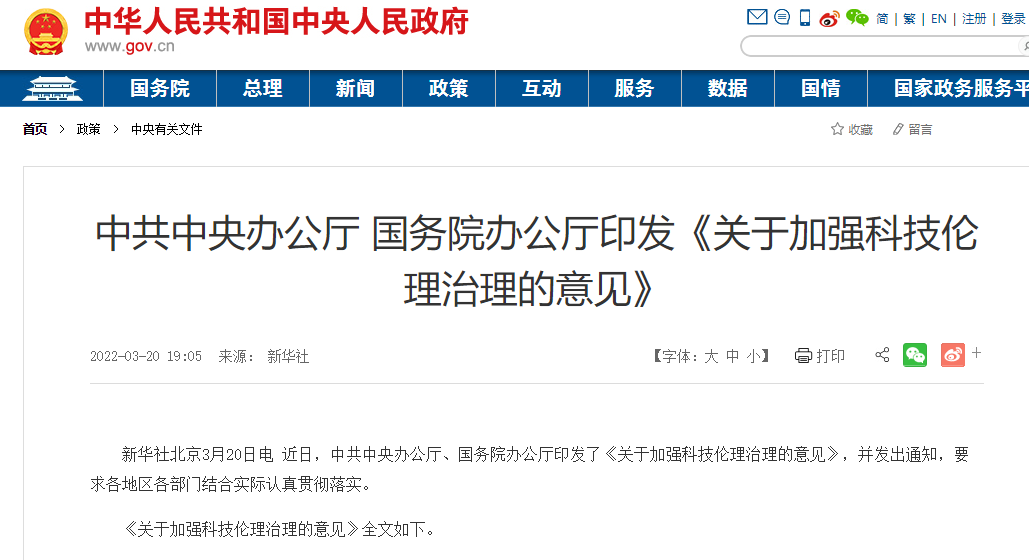 来源:中国政府网(版权归原作者所有,本文仅供交流学习,部分文章推时未能及时与原作者取得联系,若来源标注错误或侵犯到您的权益,烦请告知,我们将立即删除)封面图片来自网络中共中央办公厅 国务院办公厅印发《关于加强科技伦理治理的意见》新华社北京3月20日电...