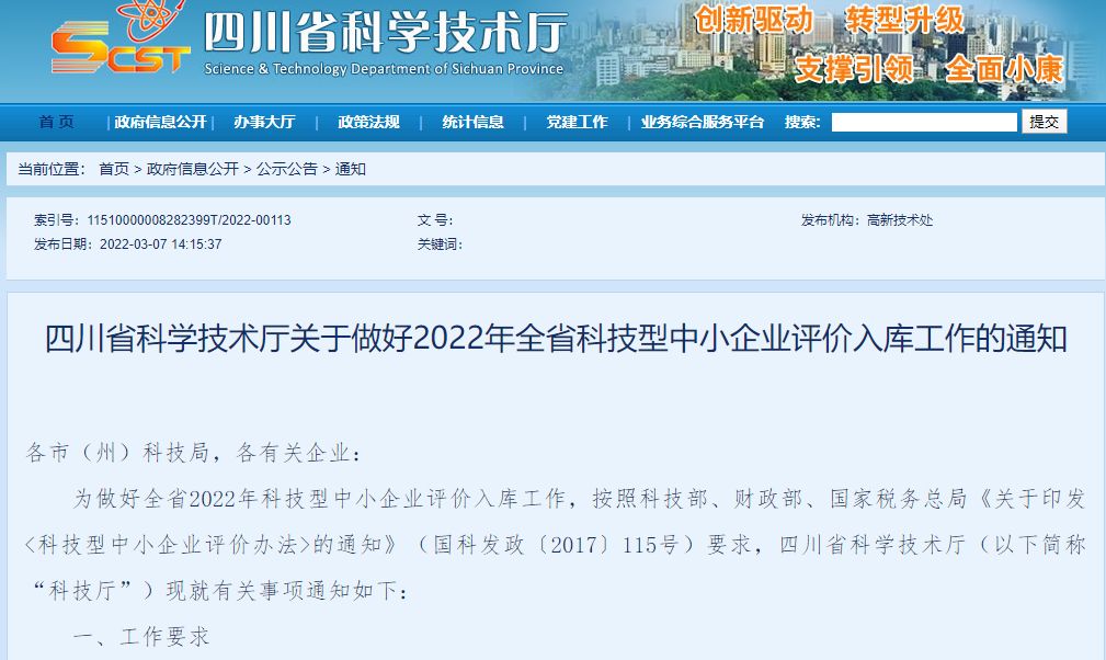 四川省科学技术厅关于做好2022年全省科技型中小企业评价入库工作的通知