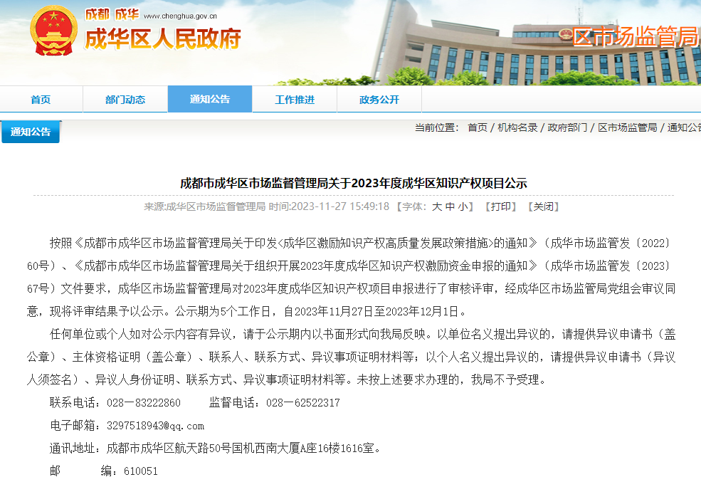 成都市成华区市场监督管理局关于2023年度成华区知识产权项目公示
