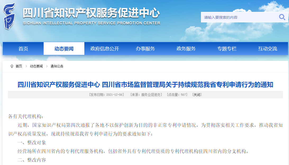 四川省知识产权服务促进中心 四川省市场监督管理局关于持续规范我省专利申请行为的通知