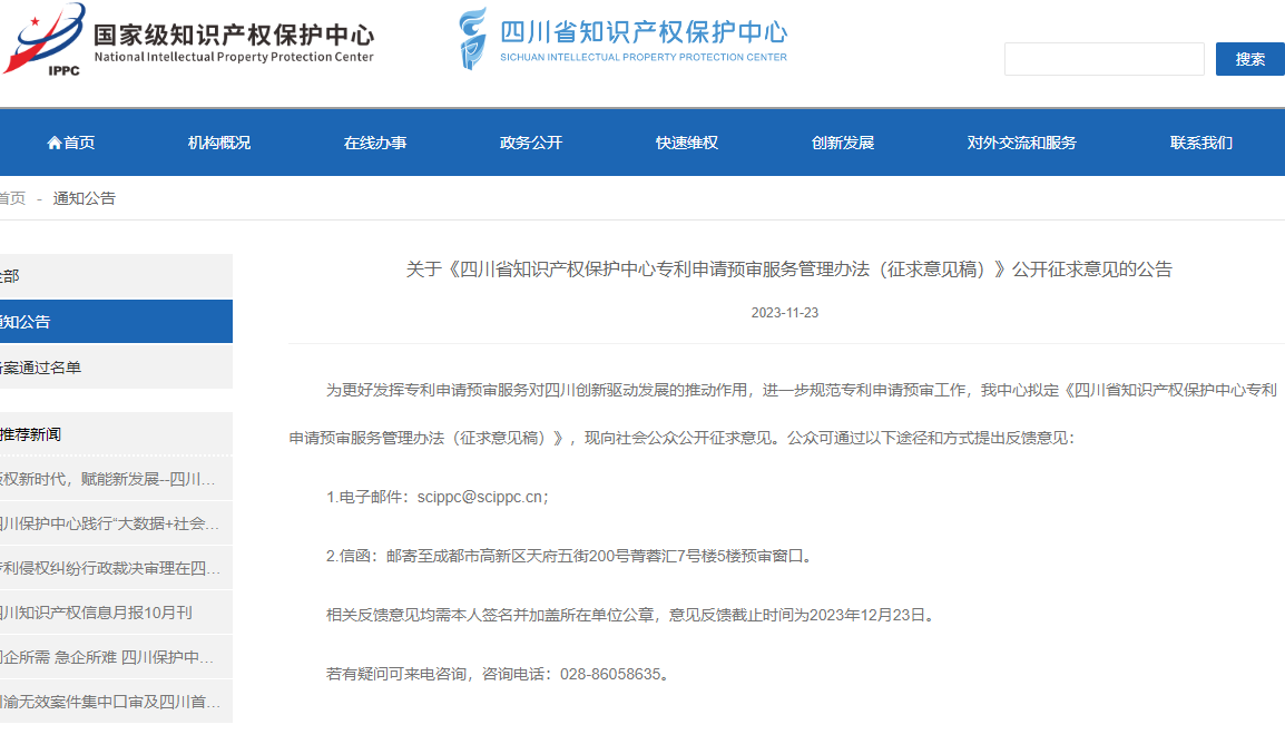 关于《四川省知识产权保护中心专利申请预审服务管理办法(征求意见稿)》公开征求意见的公告