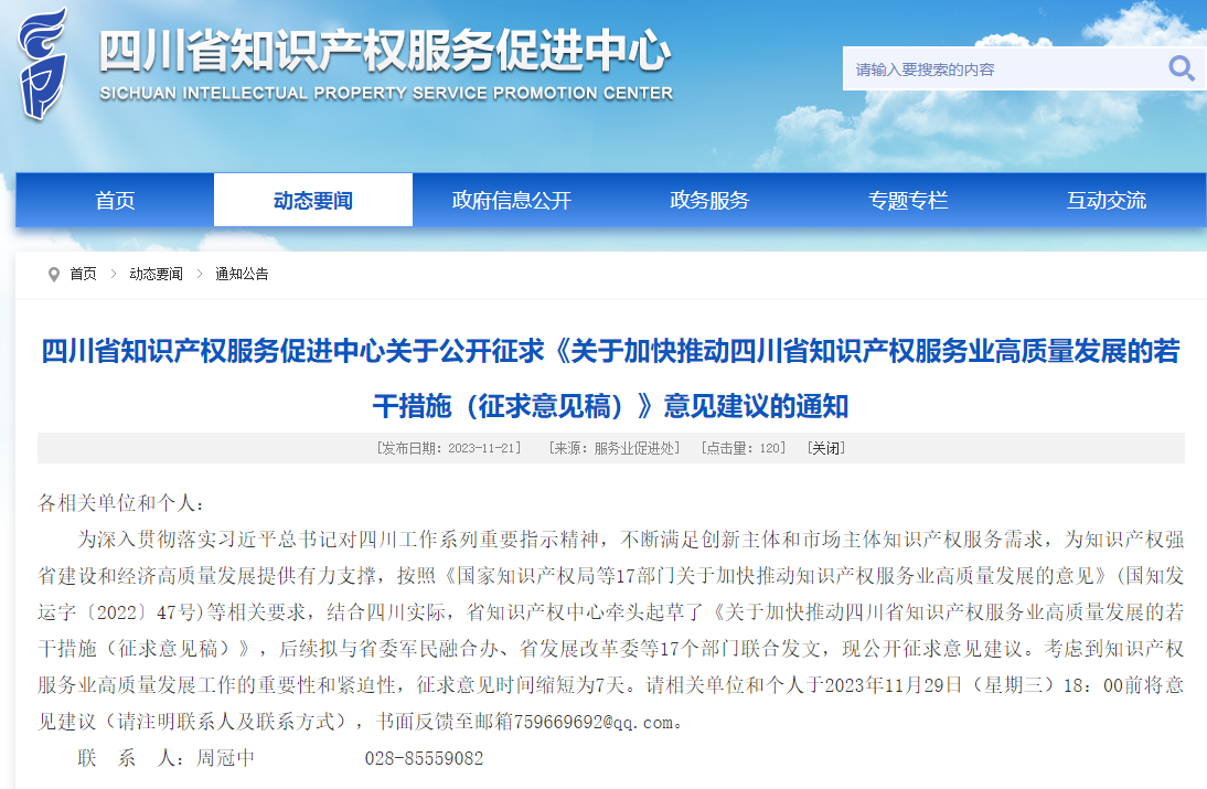 四川省知识产权服务促进中心关于公开征求《关于加快推动四川省知识产权服务业高质量发展的若干措施(征求意见稿)》意见建议的通知