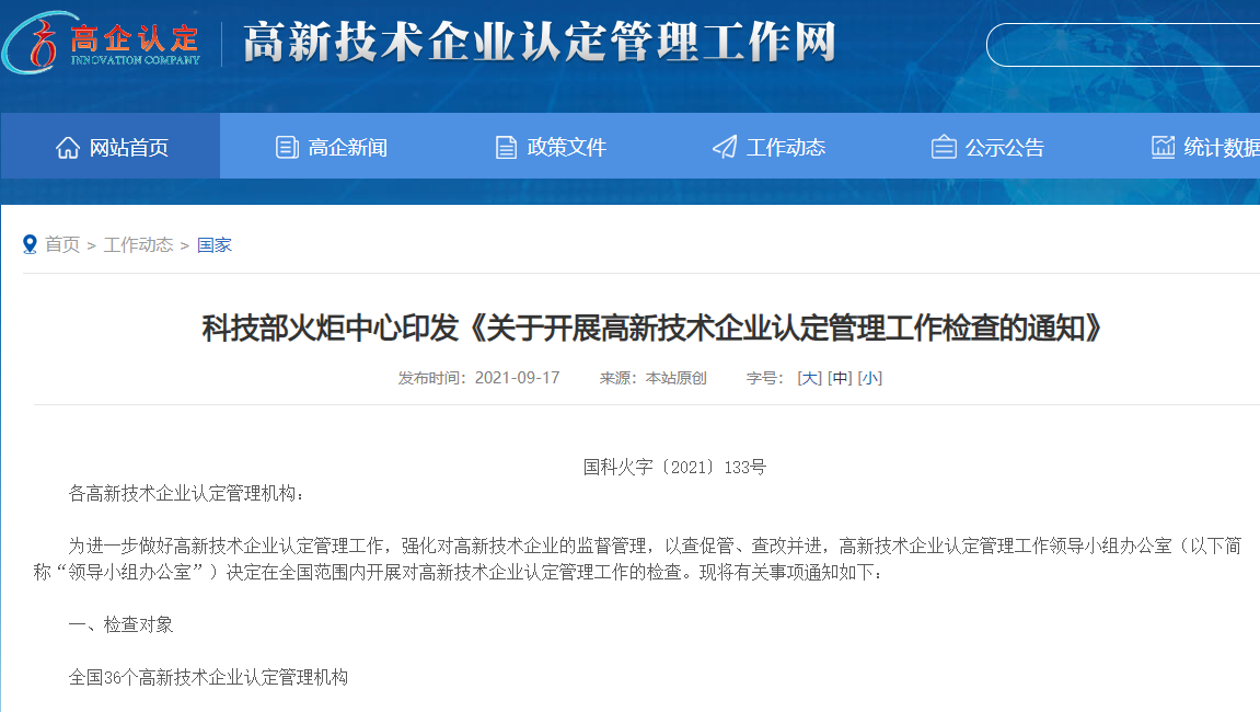 科技部火炬中心印发《关于开展高新技术企业认定管理工作检查的通知》