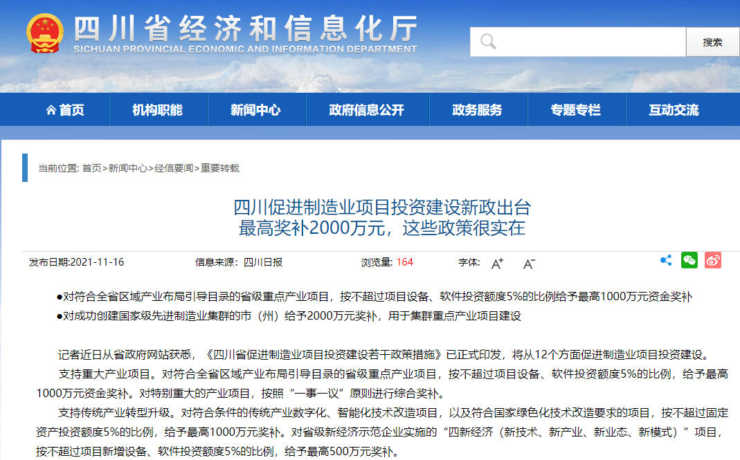 四川促进制造业项目投资建设新政出台 最高奖补2000万元,这些政策很实在