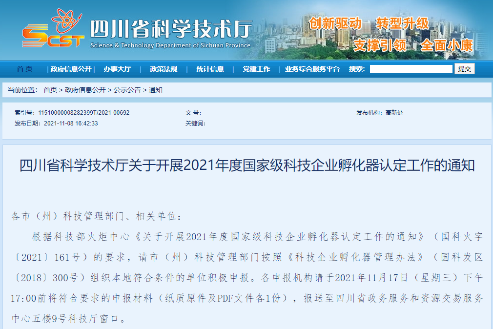 四川省科学技术厅关于开展2021年度国家级科技企业孵化器认定工作的通知