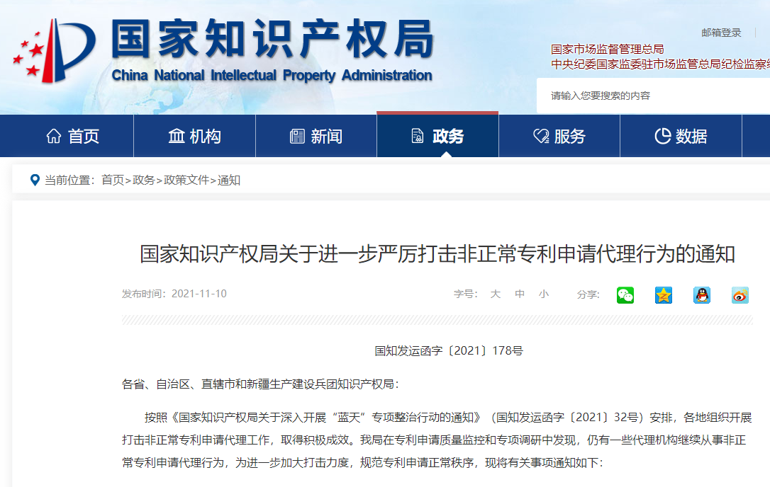 国家知识产权局关于进一步严厉打击非正常专利申请代理行为的通知