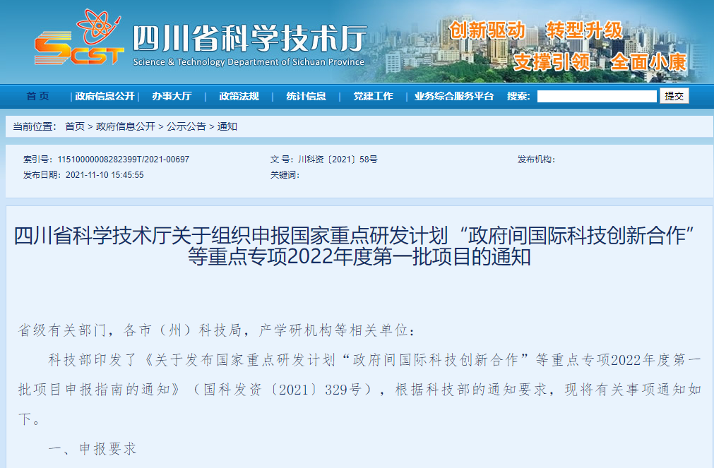 四川省科学技术厅关于组织申报国家重点研发计划“政府间国际科技创新合作”等重点专项2022年度第一批项目的通知