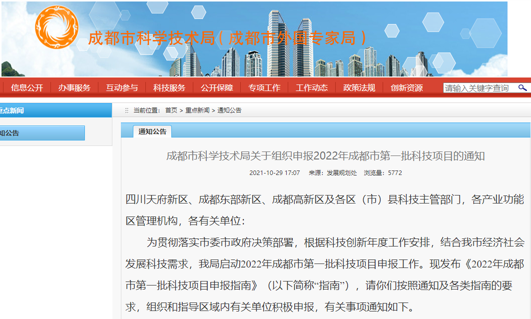 成都市科学技术局关于组织申报2022年成都市第一批科技项目的通知