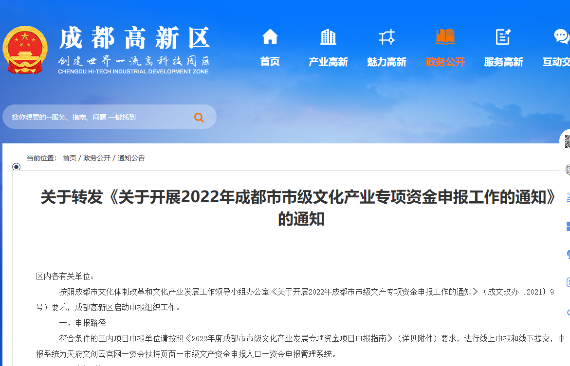 来源:成都高新区新经济发展局(版权归原作者所有,本文仅供交流学习,部分文章推时未能及时与原作者取得联系,若来源标注错误或侵犯到您的权益,烦请告知,我们将立即删除)封面图片来自网络关于转发《关于开展2022年成都市市级文化产业专项资金申报工作的通知》的通知区内各有关单位: ...