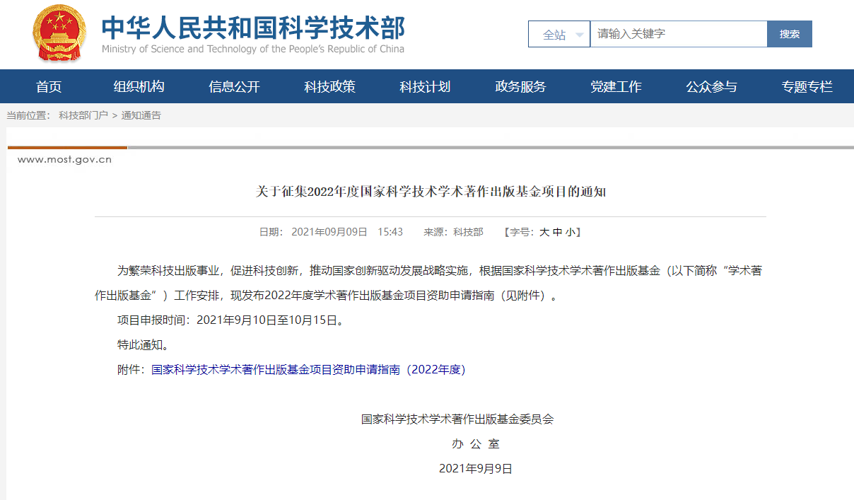 关于征集2022年度国家科学技术学术著作出版基金项目的通知