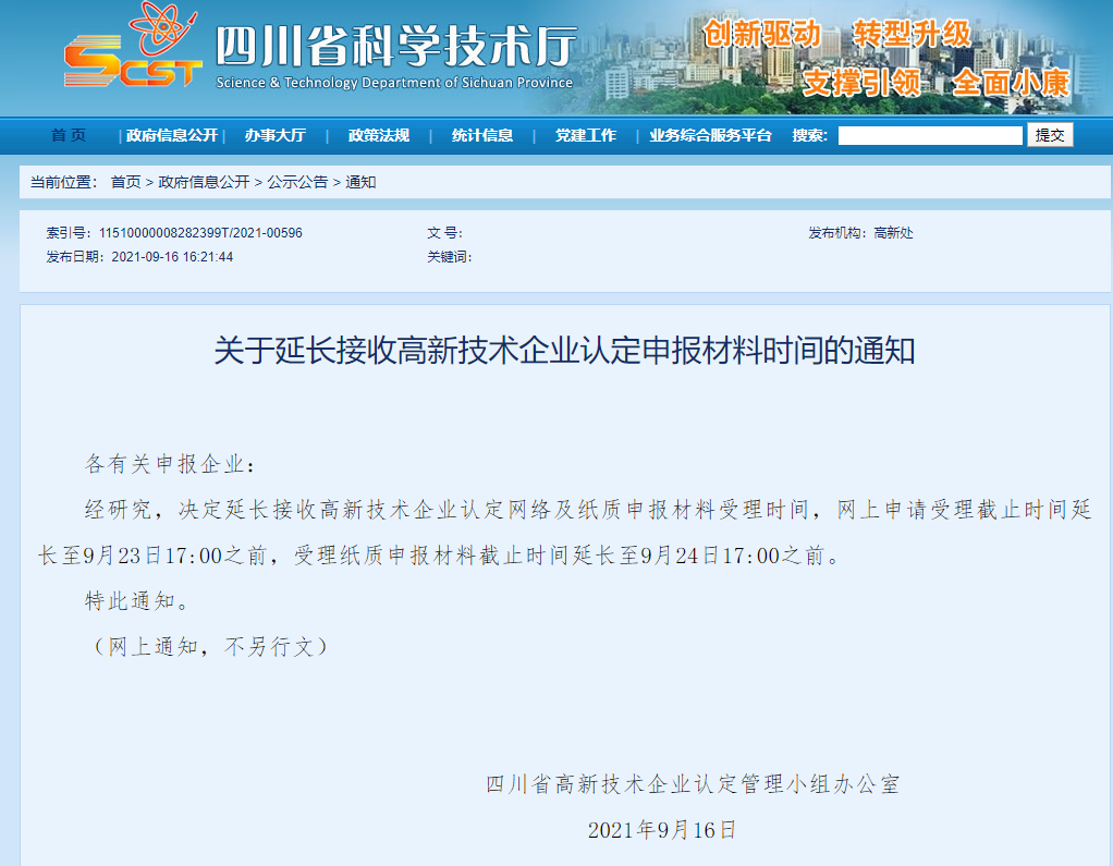 关于延长接收高新技术企业认定申报材料时间的通知