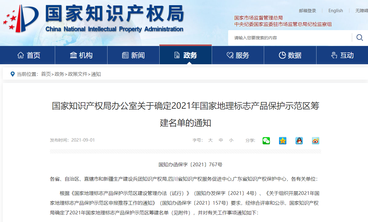 来源:国家知识产权局(版权归原作者所有,本文仅供交流学习,部分文章推时未能及时与原作者取得联系,若来源标注错误或侵犯到您的权益,烦请告知,我们将立即删除)封面图片来自网络国家知识产权局办公室关于确定2021年国家地理标志产品保护示范区筹建名单的通知国知办函保字〔2021〕767号各省、自治区、直辖市和新疆生产建设兵团知......