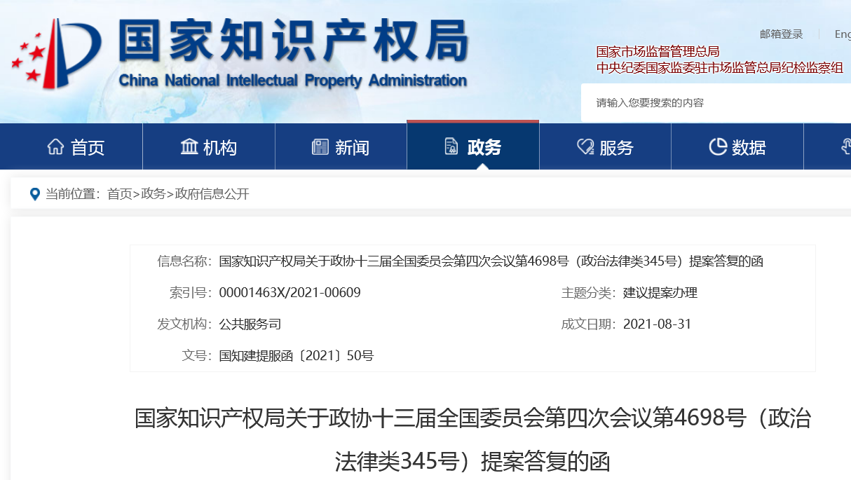 来源:国家知识产权局(版权归原作者所有,本文仅供交流学习,部分文章推时未能及时与原作者取得联系,若来源标注错误或侵犯到您的权益,烦请告知,我们将立即删除)封面图片来自网络近日,国家知识产权局发布关于政协十三届全国委员会第四次会议第4698号(政治法律类345号)提案答复的函。国家知识产权局关于政协十三届全国委员会第四次......