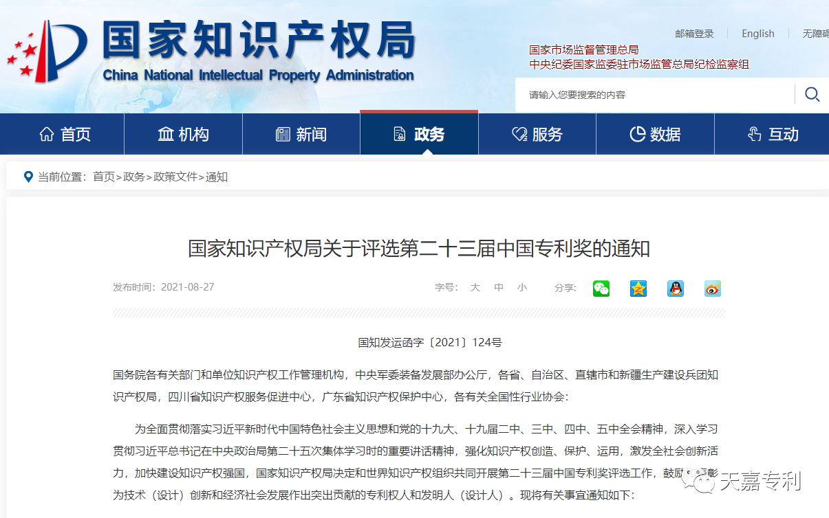 来源:国家知识产权局(版权归原作者所有,本文仅供交流学习,部分文章推时未能及时与原作者取得联系,若来源标注错误或侵犯到您的权益,烦请告知,我们将立即删除)封面图片来自网络国家知识产权局关于评选第二十三届中国专利奖的通知国知发运函字〔2021〕124号国务院各有关部门和单位知识产权工作管理机构,中央军委装备发展部办公厅,......