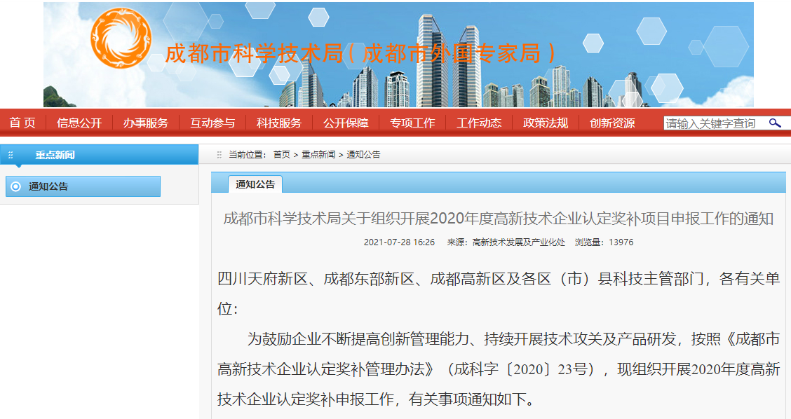 成都市科学技术局关于组织开展2020年度高新技术企业认定奖补项目申报工作的通知