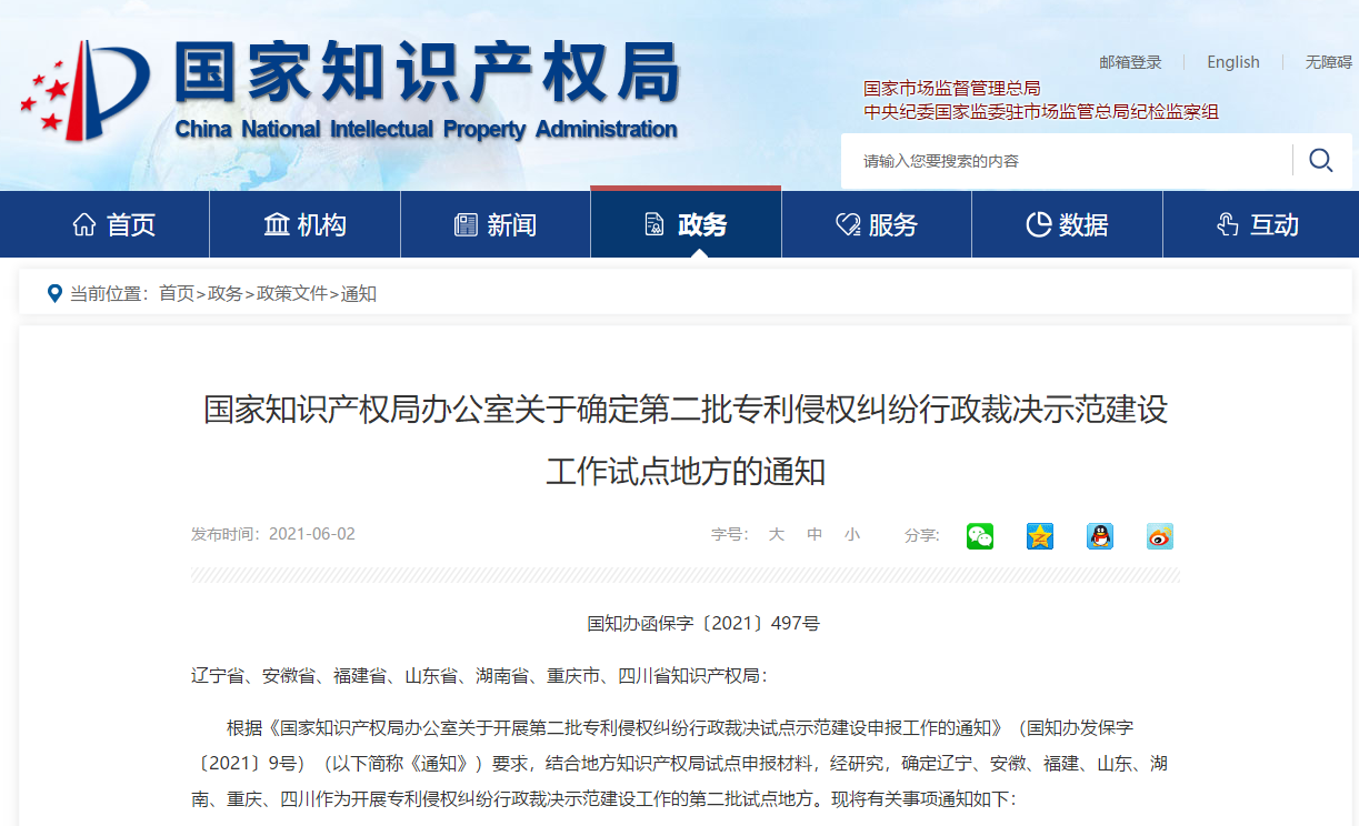 来源:国家知识产权局(版权归原作者所有,本文仅供交流学习,部分文章推时未能及时与原作者取得联系,若来源标注错误或侵犯到您的权益,烦请告知,我们将立即删除)封面图片来自网络国家知识产权局办公室关于确定第二批专利侵权纠纷行政裁决示范建设工作试点地方的通知国知办函保字〔2021〕497号辽宁省、安徽省、福建省、山东省、湖南省......