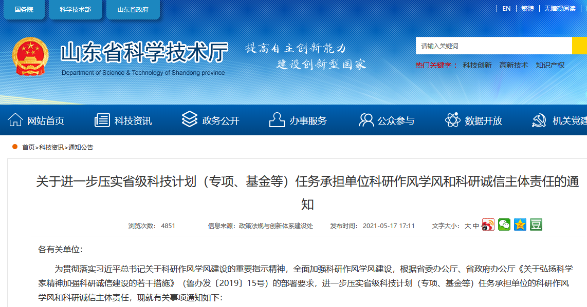 来源:山东省科学技术厅网站(版权归原作者所有,本文仅供交流学习,部分文章推时未能及时与原作者取得联系,若来源标注错误或侵犯到您的权益,烦请告知,我们将立即删除)封面图片来自网络近日,山东省科学技术厅发布关于进一步压实省级科技计划(专项、基金等)任务承担单位科研作风学风和科研诚信主体责任的通知。通知指出,各有关单位要加强......