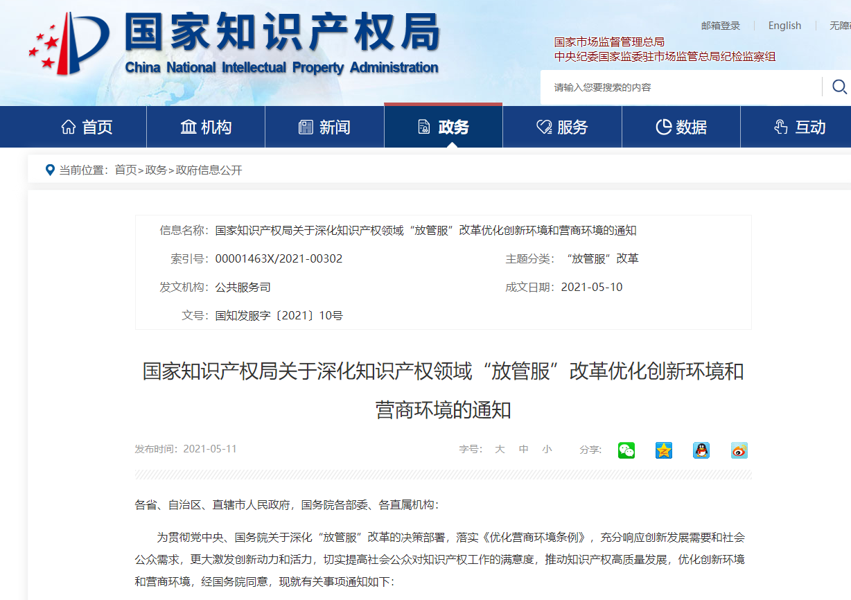国家知识产权局关于深化知识产权领域“放管服”改革优化创新环境和营商环境的通知
