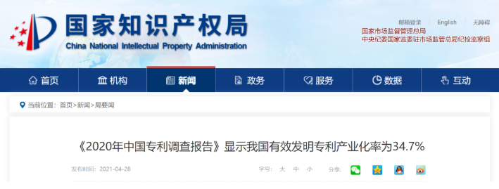 《2020年中国专利调查报告》显示我国有效发明专利产业化率为34.7%