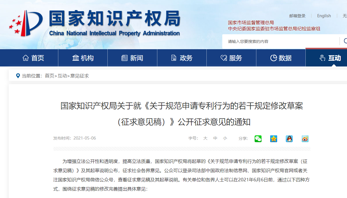 国知局对涉及“非正常申请专利”的部门规章修改草案公开征求意见