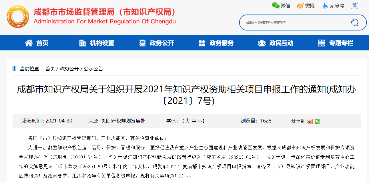 成都市知识产权局关于组织开展2021年知识产权资助相关项目申报工作的通知(成知办〔2021〕7号)