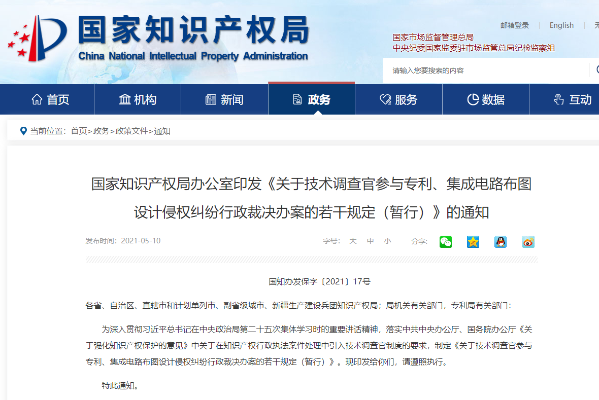 来源:国家知识产权局(版权归原作者所有,本文仅供交流学习,部分文章推时未能及时与原作者取得联系,若来源标注错误或侵犯到您的权益,烦请告知,我们将立即删除)封面图片来自网络国家知识产权局办公室印发《关于技术调查官参与专利、集成电路布图设计侵权纠纷行政裁决办案的若干规定(暂行)》的通知国知办发保字〔2021〕17号各省、自......
