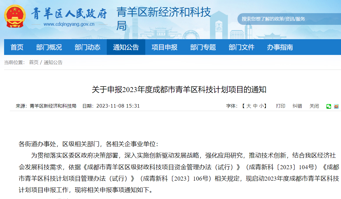 关于申报2023年度成都市青羊区科技计划项目的通知