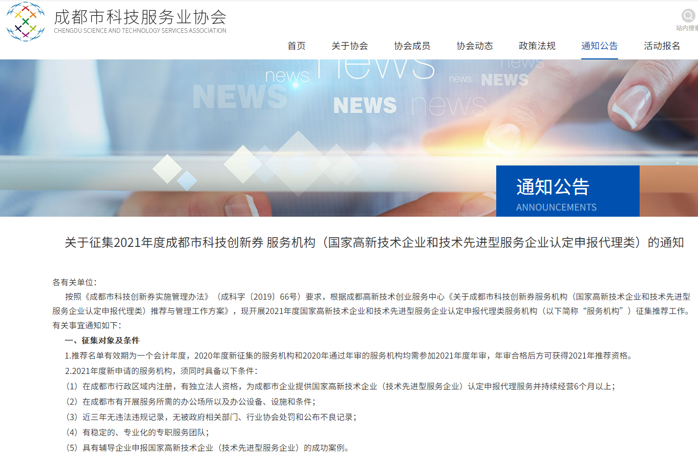 关于征集2021年度成都市科技创新券 服务机构(国家高新技术企业和技术先进型服务企业认定申报代理类)的通知
