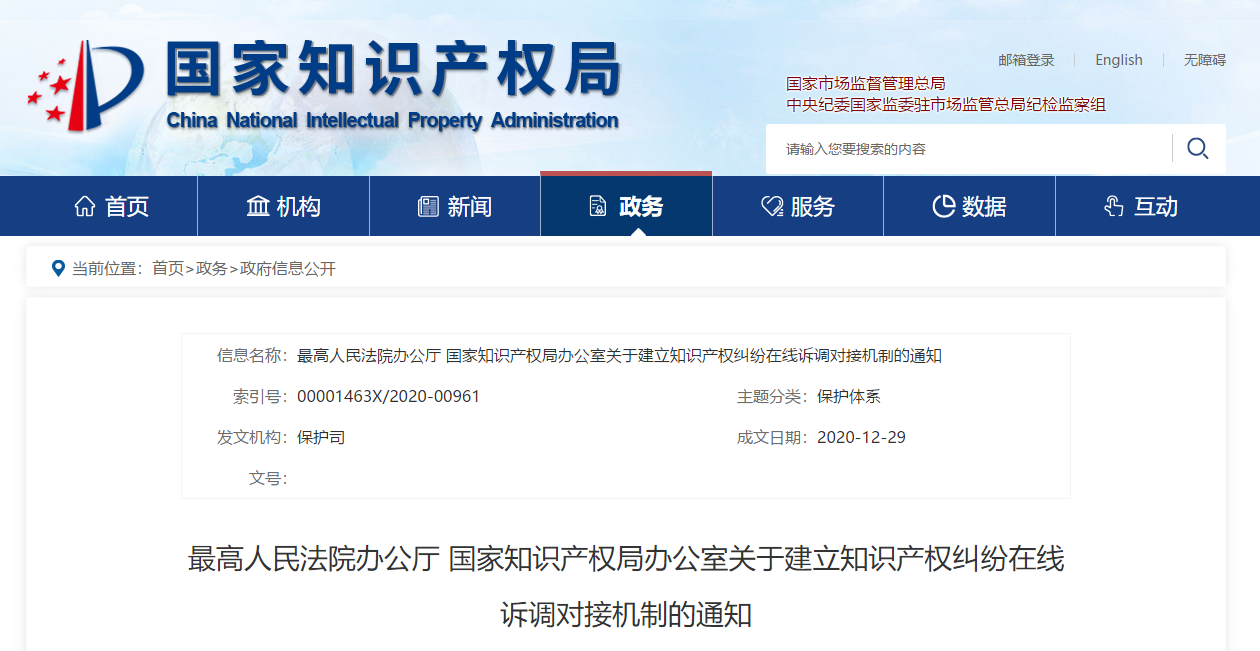 最高法、国知局:关于建立知识产权纠纷在线诉调对接机制的通知