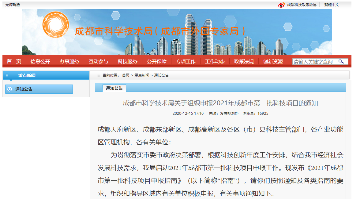 成都市科学技术局关于组织申报2021年成都市第一批科技项目的通知