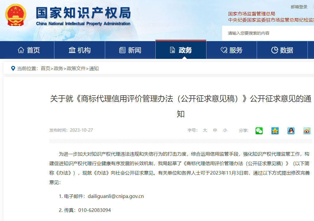 关于就《商标代理信用评价管理办法(公开征求意见稿)》公开征求意见的通知