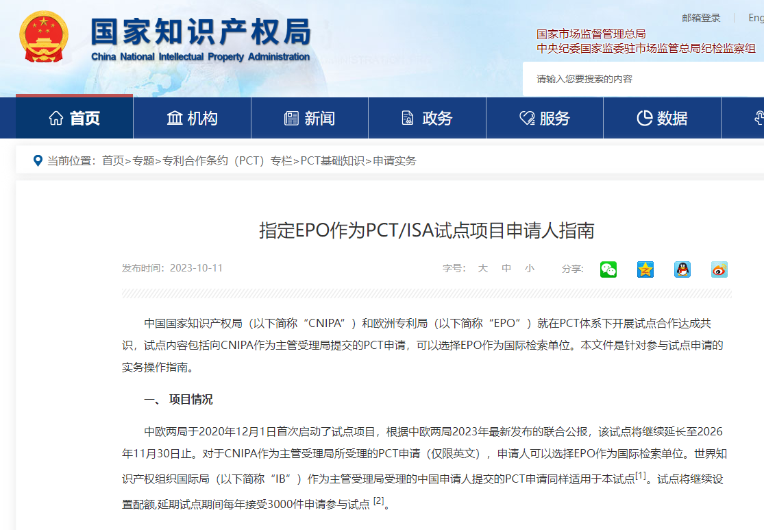 国知局发布《指定EPO作为PCT/ISA试点项目申请人指南》!