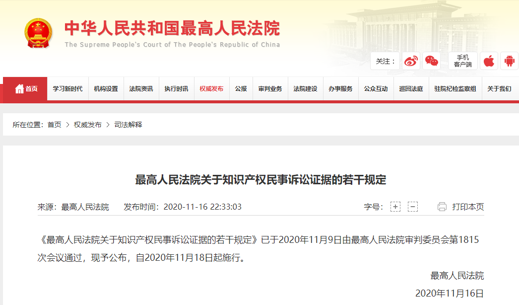 来源:最高人民法院(版权归原作者所有,本文仅供交流学习,部分文章推时未能及时与原作者取得联系,若来源标注错误或侵犯到您的权益,烦请告知,我们将立即删除)封面图片来自网络2020年11月16日,最高人民法院发布《关于知识产权民事诉讼证据的若干规定》(以下简称《知产证据规定》),该司法解释将于2020年11月18日施行。最......