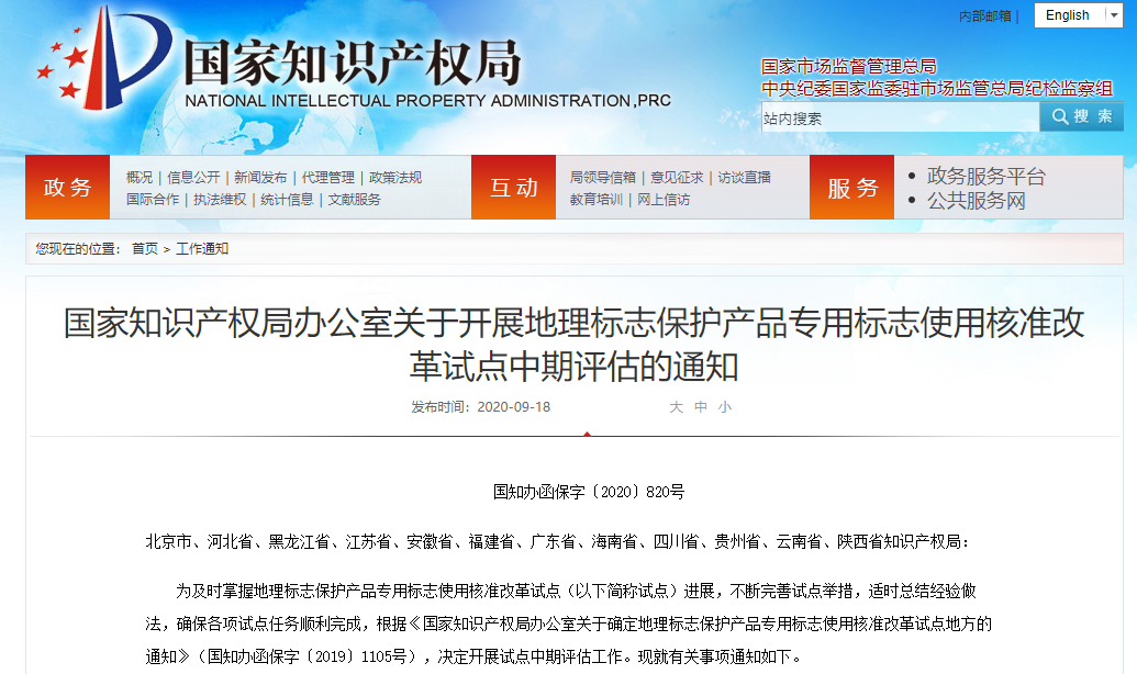 来源:国家知识产权局(版权归原作者所有,本文仅供交流学习,部分文章推时未能及时与原作者取得联系,若来源标注错误或侵犯到您的权益,烦请告知,我们将立即删除)封面图片来自网络国家知识产权局办公室关于开展地理标志保护产品专用标志使用核准改革试点中期评估的通知国知办函保字〔2020〕820号北京市、河北省、黑龙江省、江苏省、安......