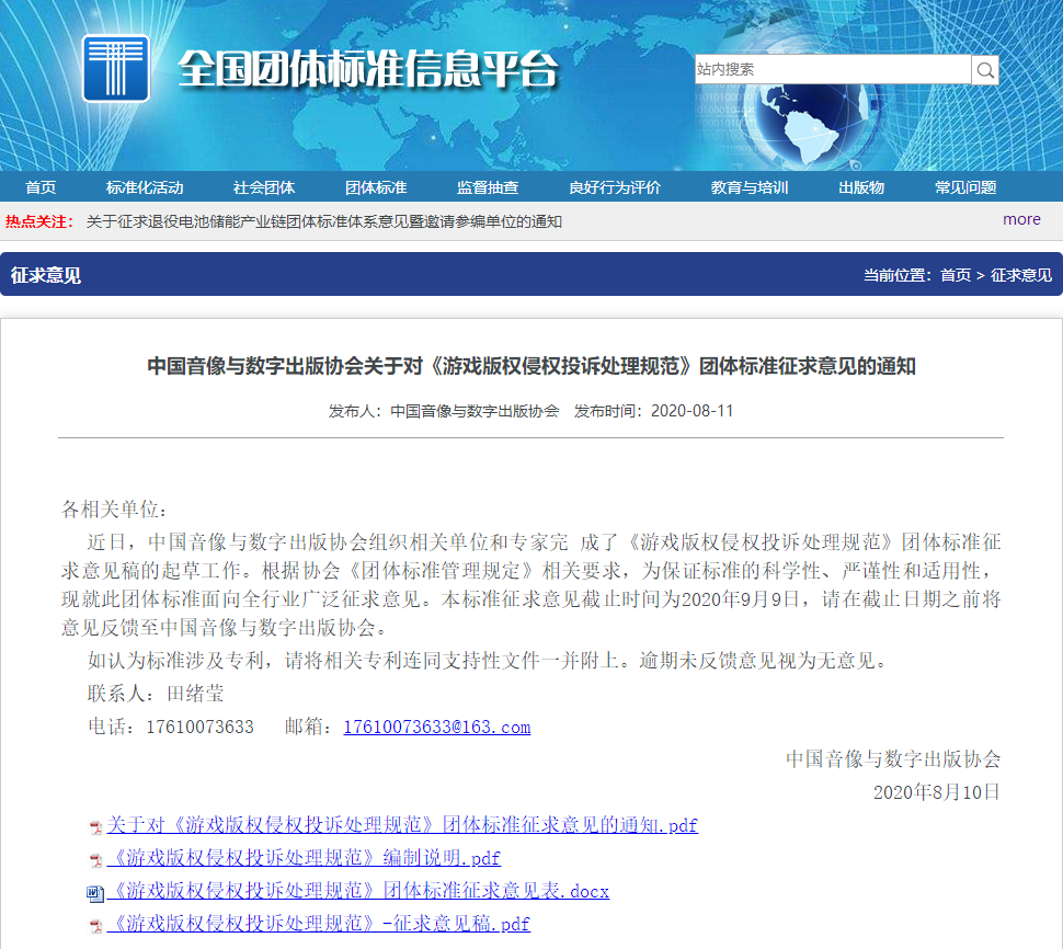 来源:全国团体标准信息平台(版权归原作者所有,本文仅供交流学习,部分文章推时未能及时与原作者取得联系,若来源标注错误或侵犯到您的权益,烦请告知,我们将立即删除)封面图片来自网络中国音像与数字出版协会关于对《游戏版权侵权投诉处理规范》团体标准征求意见的通知发布人:中国音像与数字出版协会...