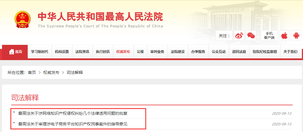 最高院发布网络侵权和电子商务平台知识产权民事案件相关批复及指导文件