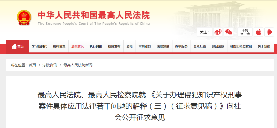 最高人民法院、最高人民检察院就《关于办理侵犯知识产权刑事案件具体应用法律若干问题的解释(三)(征求意见稿)》向社会公开征求意见