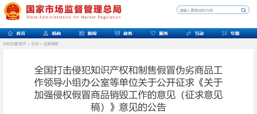 关于公开征求《关于加强侵权假冒商品销毁工作的意见(征求意见稿)》意见的公告