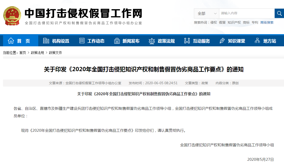 关于印发《2020年全国打击侵犯知识产权和制售假冒伪劣商品工作要点》的通知